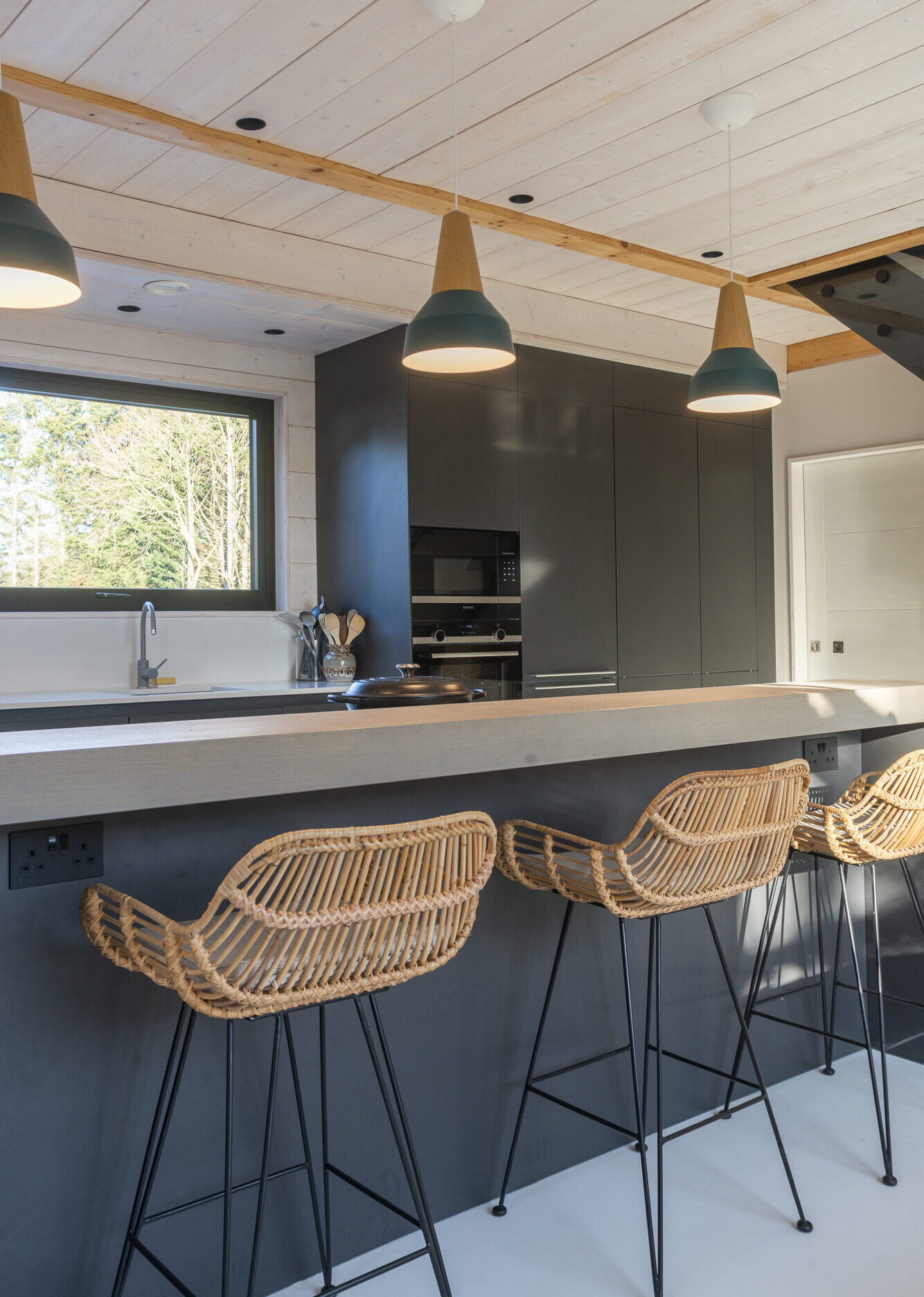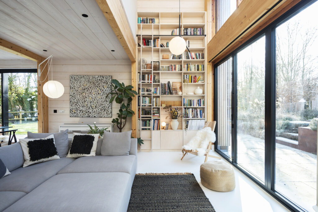 Constructed using a modular system, the house features spacious open-plan interiors, long sightlines, and generous glazing that draws in natural light throughout the day. The architecture is clean and confident, with a restrained material palette that brings warmth without distraction. Timber, glass, and concrete are balanced in a way that feels both contemporary and timeless.
